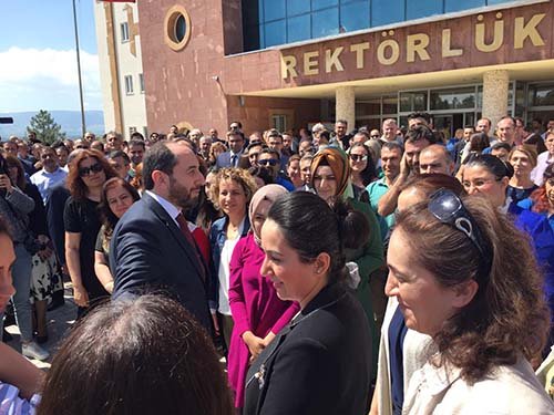 Uğurla sırasında alkışlanan Alkan'ın arkasından akademisyenlerin ve üniversite çalışanlarının gözyaşlarına hakim olmadağı görüldü.