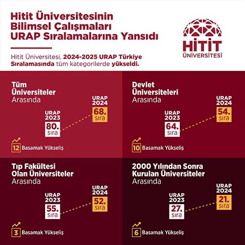 Hitit Üniversitesi'nin, URAP tarafından açıklanan 2024-2025 Türkiye Sıralamasında (Geçen yıla göre) tüm kategorilerde başarı sırasını yükselttiği açıklandı.